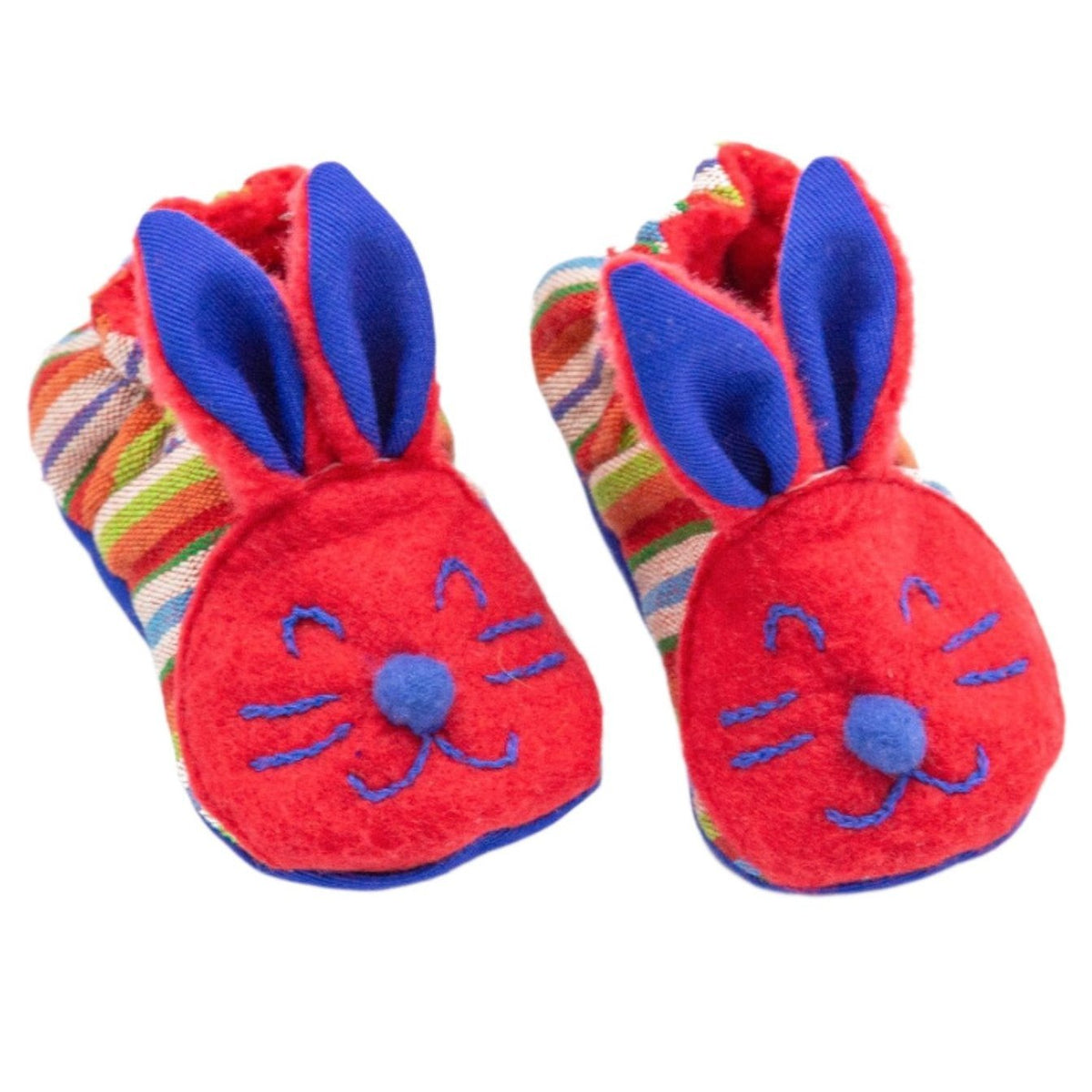 Our best-selling baby booties now come in an adorable bunny design - how cute! A soft fleece bunny and traditional Guatemalan fabric line the exterior, and each pair has a flannel interior to keep your little one's toes warm. One size fits most infants, what a perfect gift for expecting mothers! In addition, there are no irritating closures - a light elastic in the back will keep these in place. Handmade and Fair Trade!