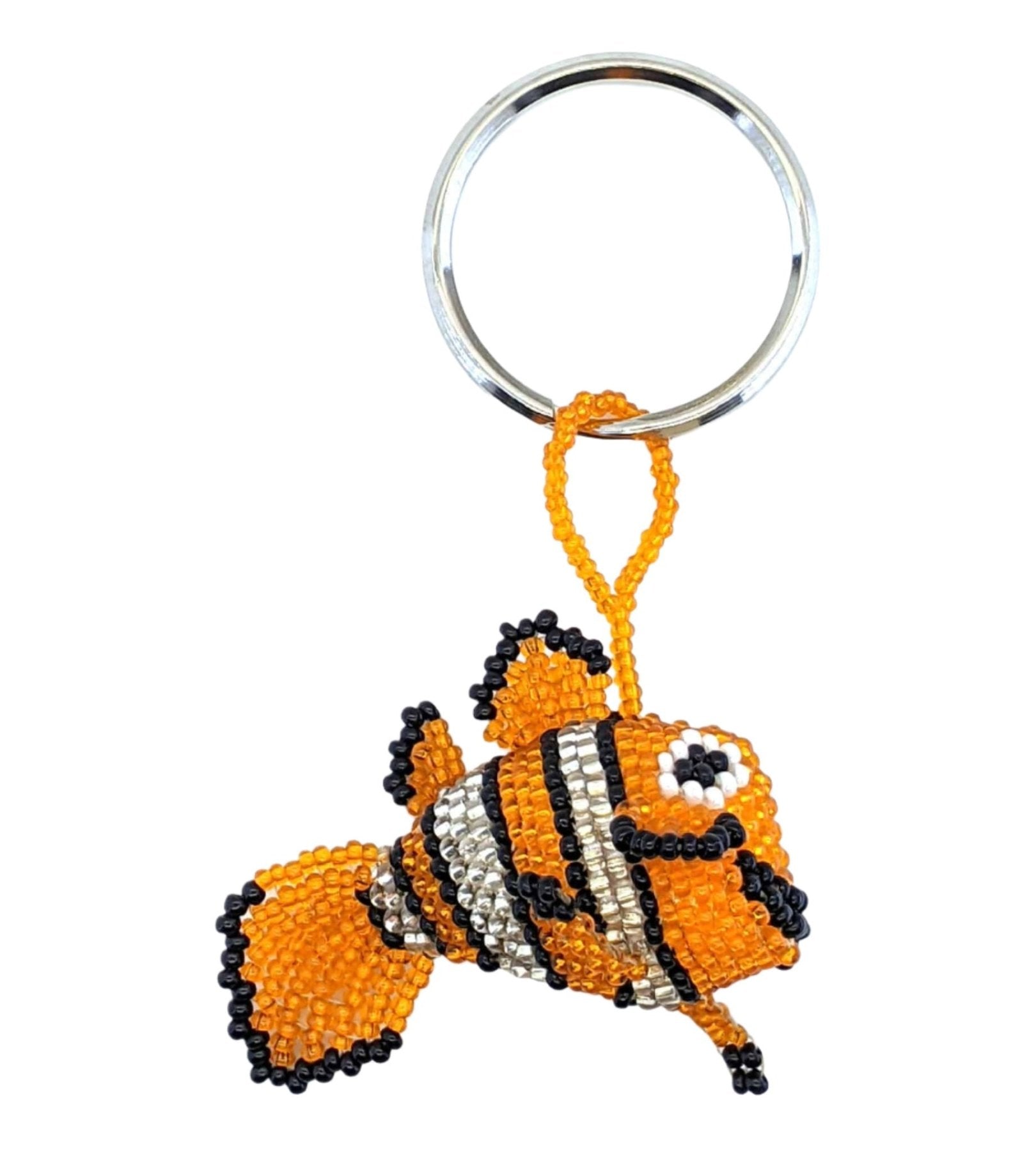Precio unitario porNuestro colgante de adorno/llavero/mochila de pez payaso con cuentas está hecho a mano por artesanas mayas utilizando cuentas de vidrio checo de alta calidad e hilo de cuentas profesional. Las cuentas de vidrio checo, cuando se ven bajo un microscopio, refractan la luz de maneras complicadas, lo que las hace bastante vibrantes. Son duraderos, no destiñen y suaves.