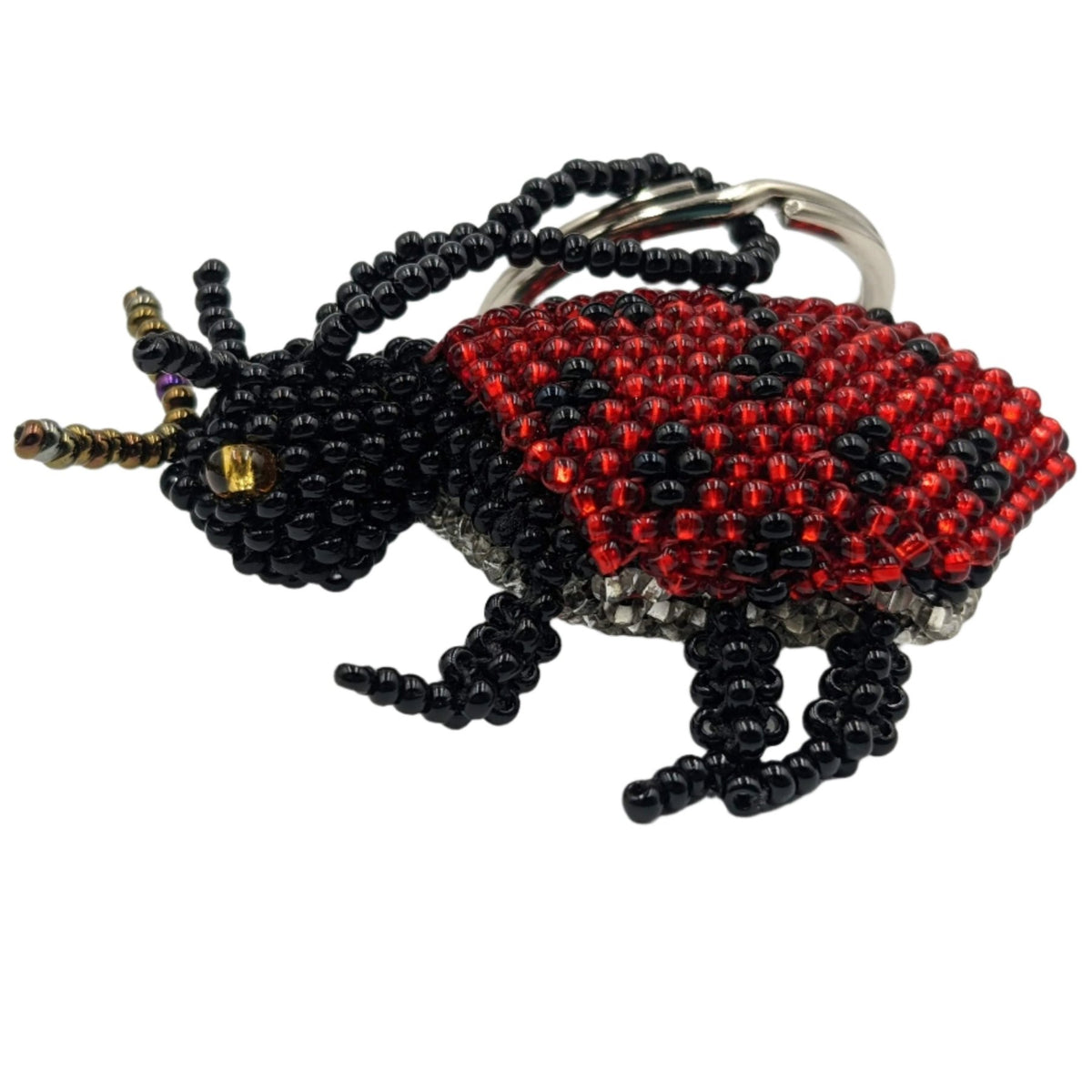 Nuestro adorno/llavero/mochila de mariquita con cuentas está hecho a mano por artesanas mayas utilizando cuentas de vidrio checo de alta calidad e hilo de cuentas profesional. Las cuentas de vidrio checo, cuando se ven bajo un microscopio, refractan la luz de maneras complicadas, lo que las hace bastante vibrantes. Son duraderos, no destiñen y suaves.