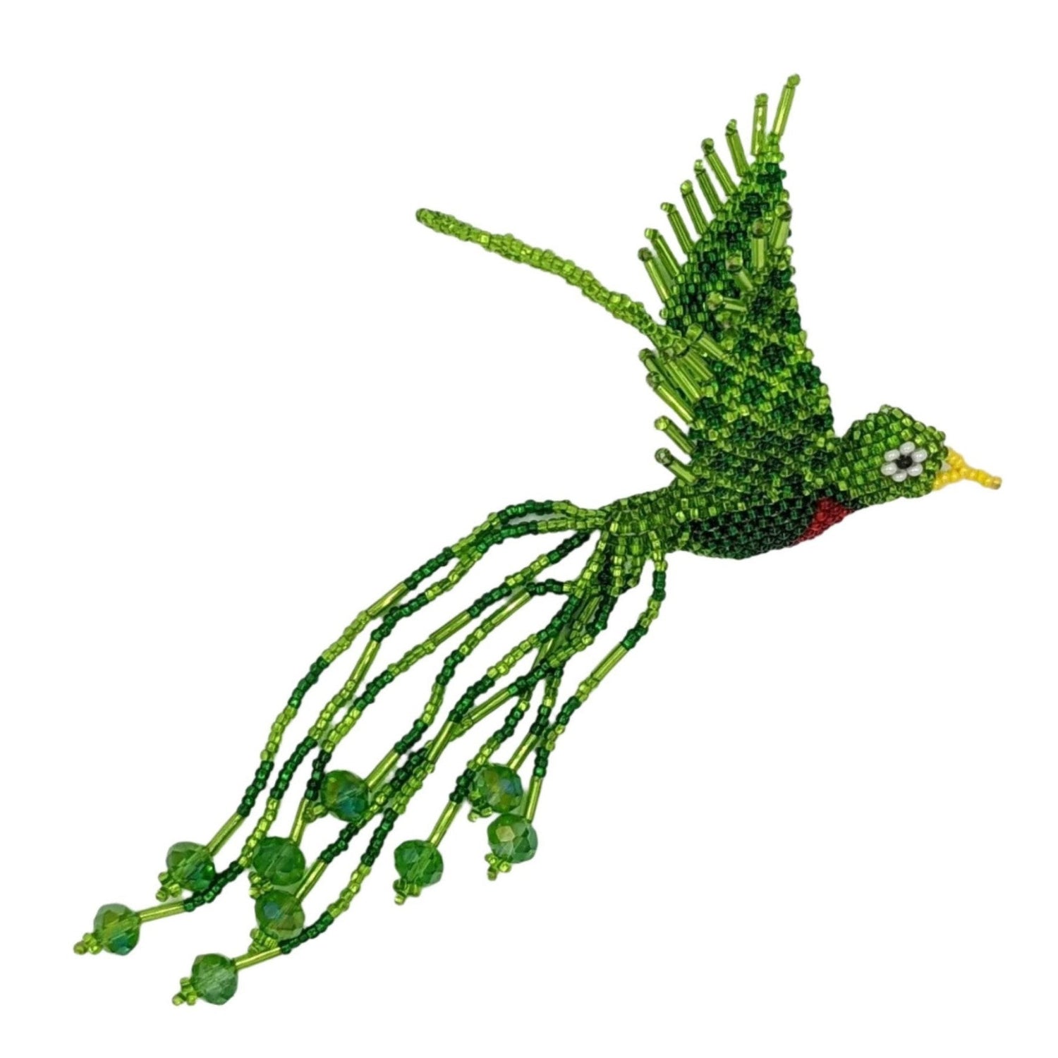 Precio unitario porThe quetzal is the national bird of Guatemala. Our quetzal beaded ornament / backpack charm is handmade by Maya women artisans using high quality Czech glass beads and professional beading thread. Czech glass beads, when viewed under a microscope, refract light in complicated ways, leading them to be quite vibrant. They are durable, colorfast, and smooth.