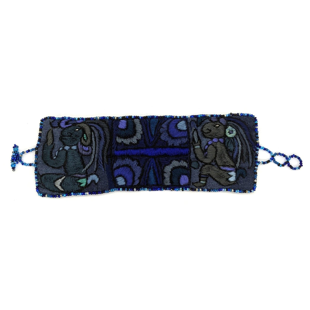 Pulsera de Dioses y Símbolos Mayas en Azules y Grises Bordada a Mano con Cierre de Cuentas de Vidrio