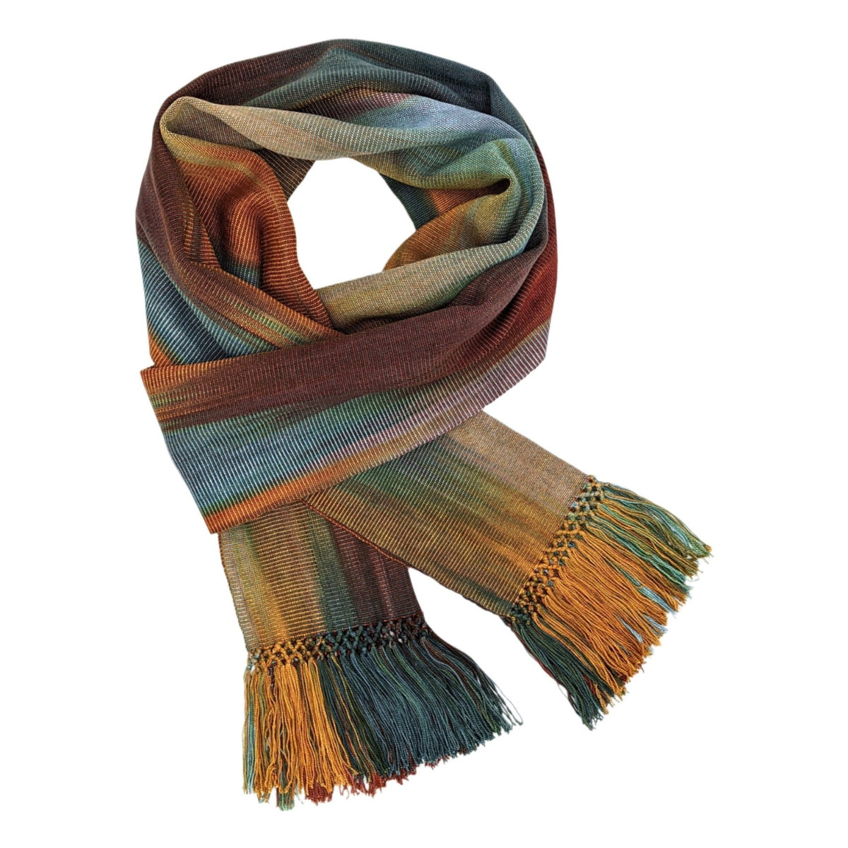 Las madejas de hilo de bambú hechas de fibra de bambú cultivada orgánicamente* en China se tiñen a mano en cuatro a seis colores, en pequeños lotes. Todos estos colores aparecen en los flecos y en un patrón de jaspe único en toda la bufanda. (¡Cada bufanda es única!) Luego, el hilo de cada bufanda se deforma en una tabla de urdimbre. Las urdimbres son transportadas a los pueblos donde viven y distribuidas las tejedoras. La mujer pone la urdimbre en un telar de cintura, ata un extremo del telar a un árbol o a una casa y el otro a una correa que rodea su cintura. Teje la bufanda a mano y se detiene de vez en cuando para cocinar o cuidar a sus hijos. Cuando se completa el tejido, los flecos se anudan a mano, la bufanda se lava a mano y se agrega suavizante durante el enjuague. Luego el tejido se seca al sol. Luego se terminan los flecos, se realiza un control de calidad completo y se empaqueta la bufanda para enviarla a A Thread of Hope.