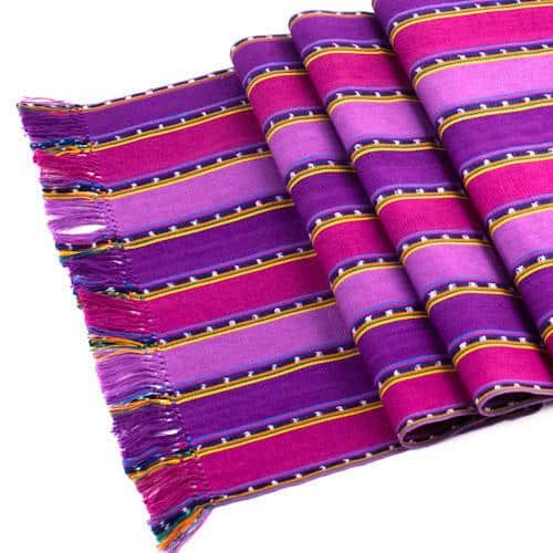 El colorido y resistente camino de mesa Zunil morado está tejido a mano en el telar de cintura con tonos morados y franjas estrechas contrastantes de amarillo dorado y jaspe. Servilletas a juego y servilletas a juego disponibles. Hecho a mano y de comercio justo.